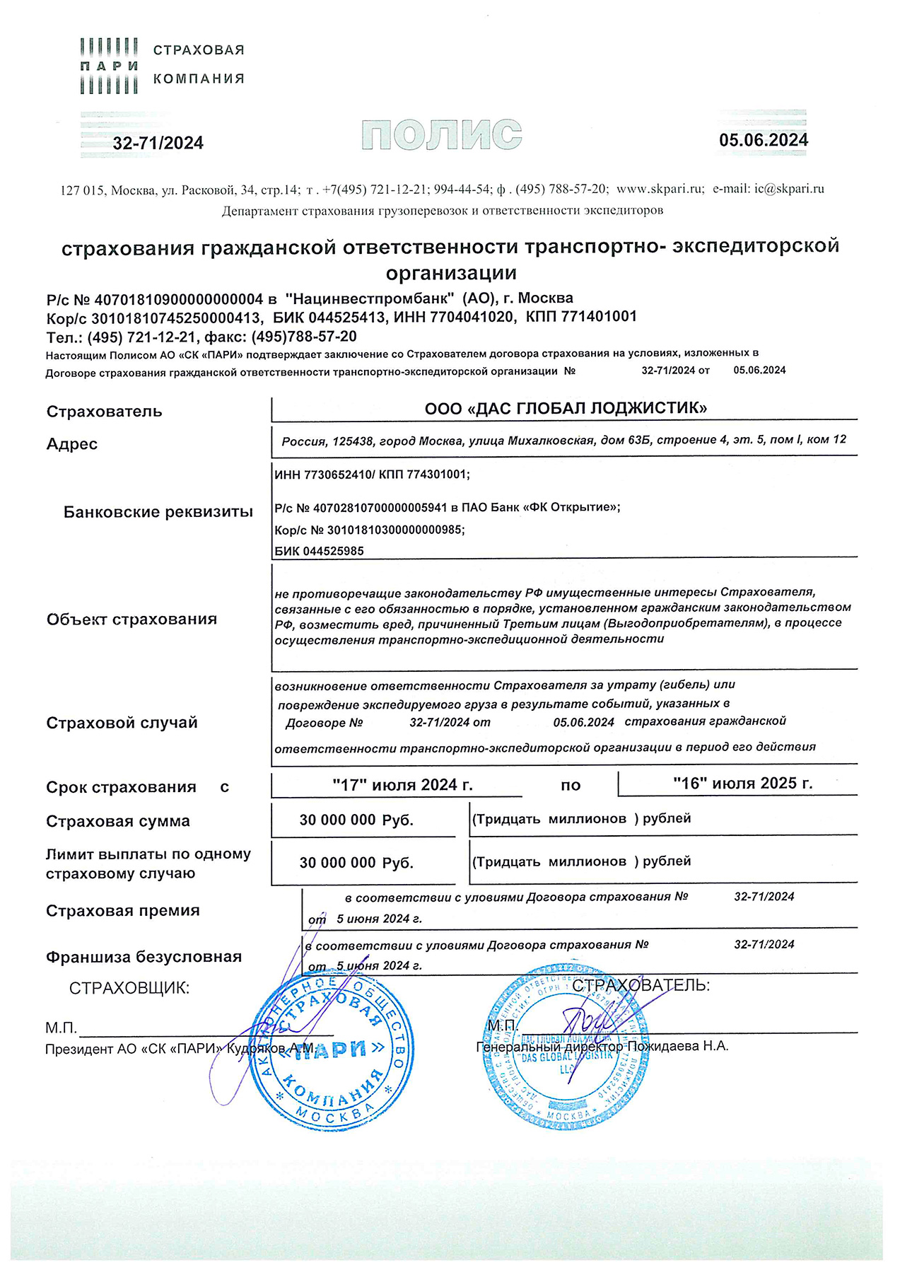 Страховая Компания АО СК ПАРИ Полис № 32-71/2024