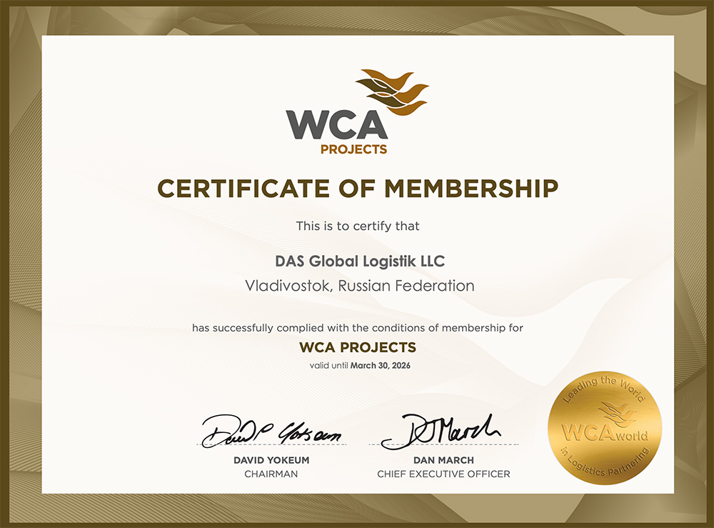 - Сертификат WCA PROJECTS, подтверждающий членство в международной ассоциации WCA PROJECTS по проектным грузам на 2026 г.